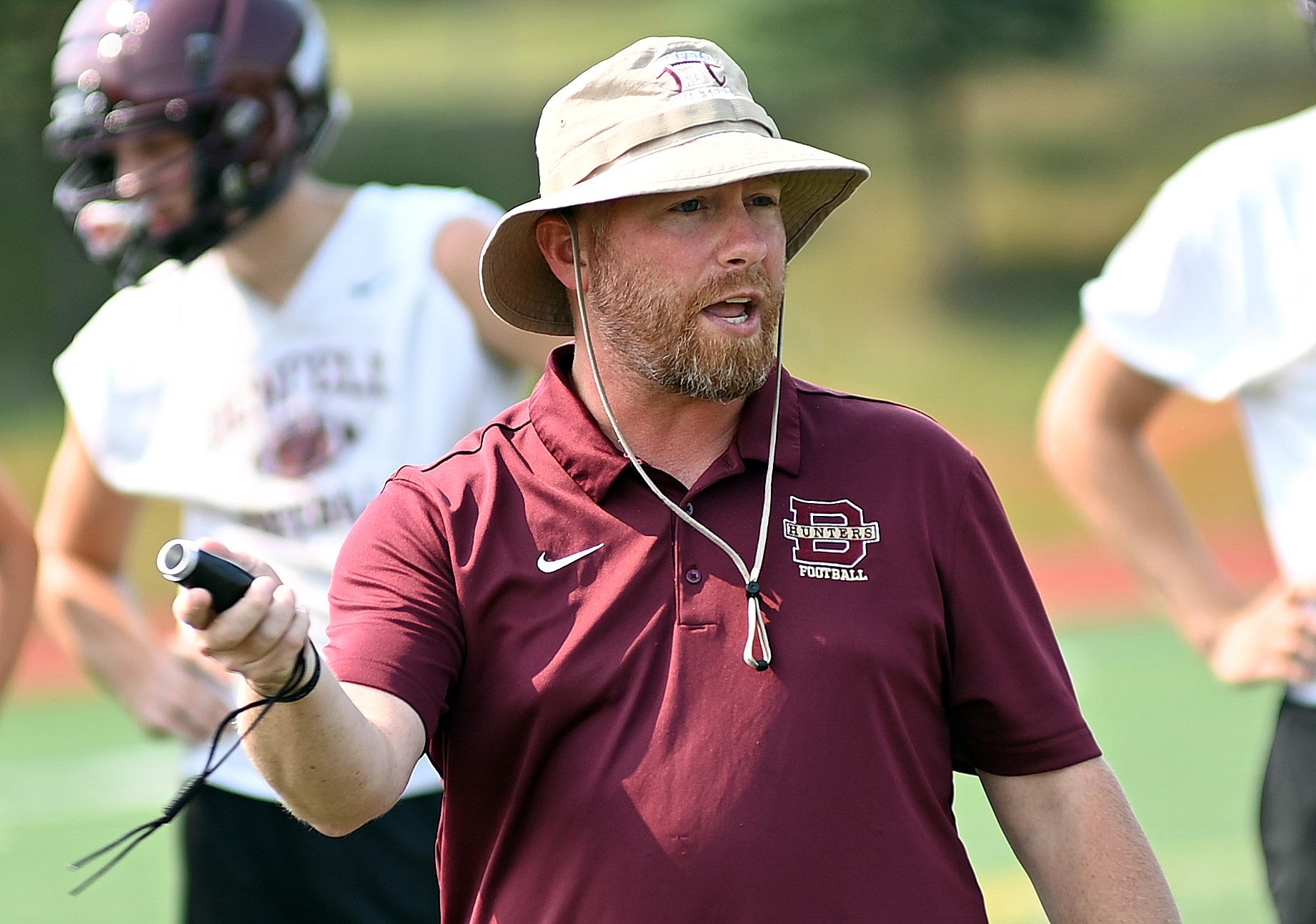 Duluth Denfeld football coach Erik Lofald spoke to his players before practice on Tuesday. The Hunters are scheduled to open at nonconference Esko on Thursday, Sept. 2. Howie Hanson / duluthtimes.cherryroad.news